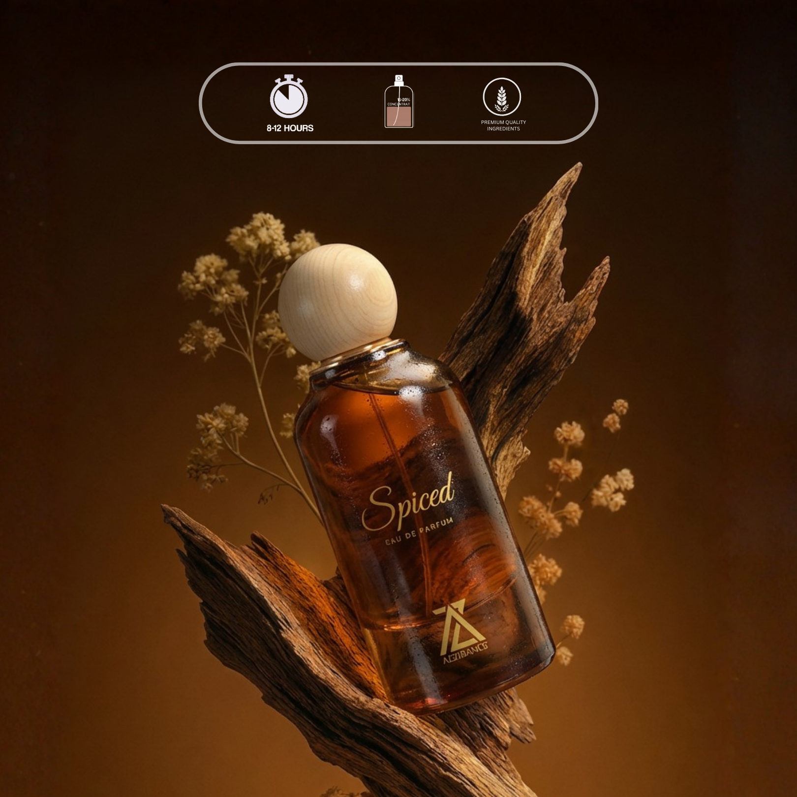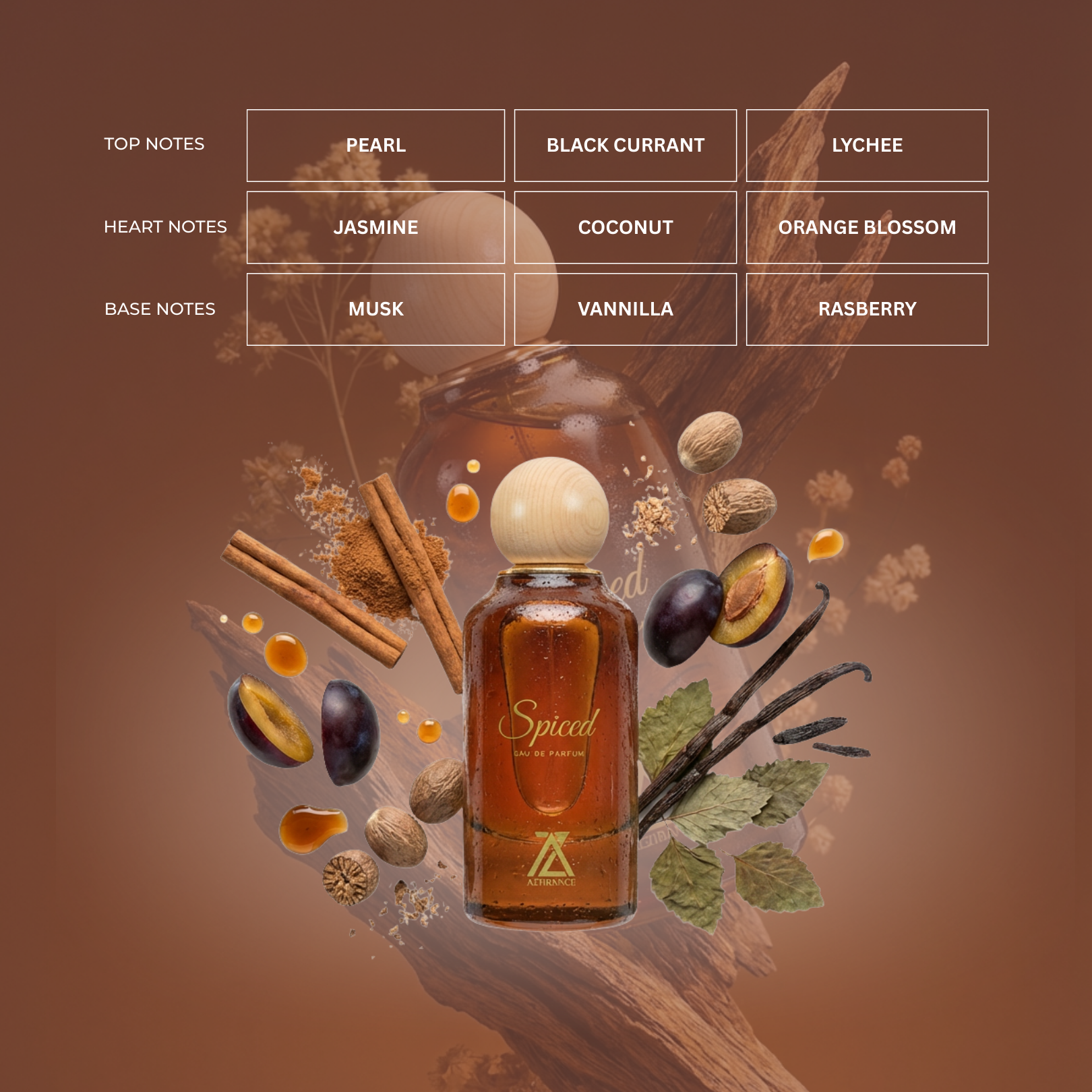 Azhrance Spiced: A warm mix of cinnamon, nutmeg, and cognac, balanced with plum, vanilla, and patchouli. Rich and inviting, perfect for adding warmth to any occasion.